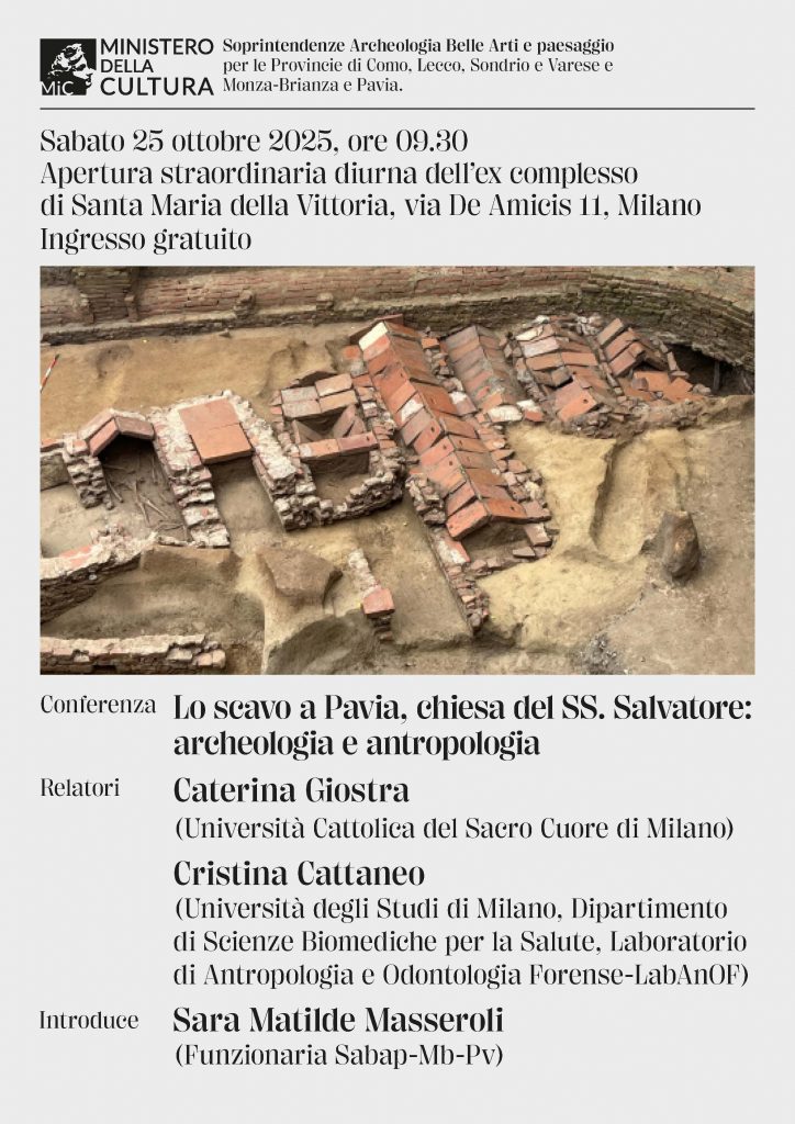 Nell’occasione, alle 9:30 sarà possibile assistere alla conferenza di Caterina Giostra e Cristina Cattaneo, Lo scavo a Pavia, chiesa del SS. Salvatore: archeologia e antropologia.